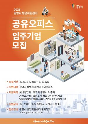 광명시(시장 박승원)는 오는 23일까지 관내 창업기업의 사무공간 부담을 덜고 안정적인 창업 환경을 조성하기 위해 ‘광명시 창업지원센터 공용오피스’에 입주할 창업기업을 모집한다.…