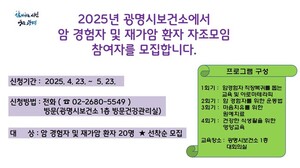 광명시 보건소는 오는 5월 23일까지 재가암환자와 암 경험자를 대상으로 자조모임 참여자 20명을 선착순으로 모집한다.이번 자조모임은 암 극복 사례와 치료 경험을 공유하며, 심리적…