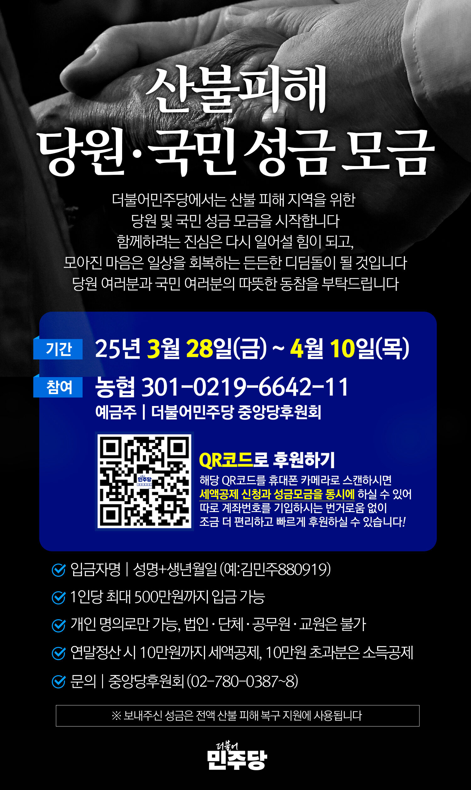 [산불피해 당원.국민 성금 모금]더불어민주당에서는 산불 피해 지역을 위한 당원 및 국민 성금 모금을 시작합니다.함께하려는 진심은 다시 일어설 힘이 되고, 모아진 마음은 일상을…